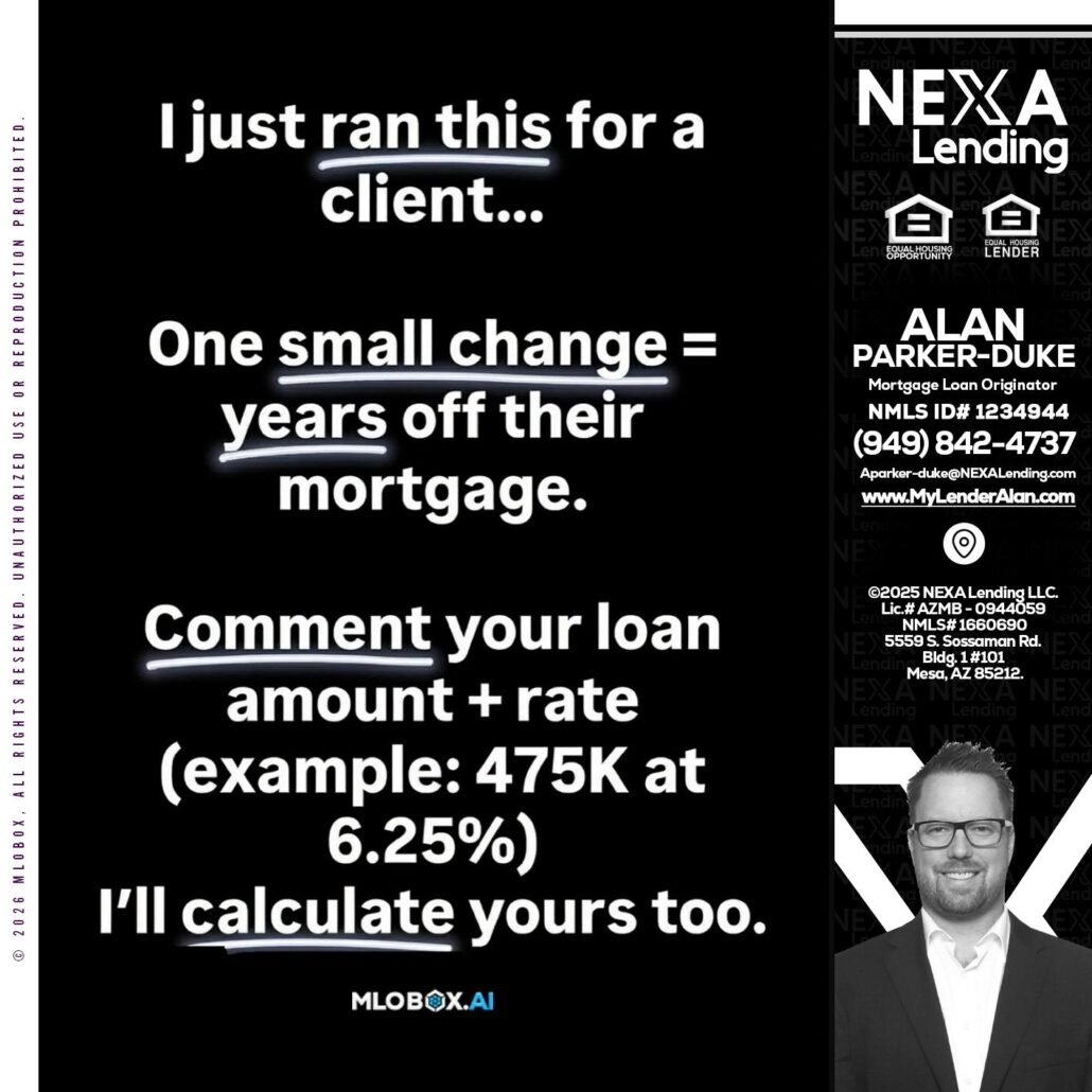 Hi, my name is Alan Parker-Duke. I’m a Loan Officer with NEXA Lending LLC., offering personalized mortgage solutions, fast customized quotes, great rates and service with integrity.